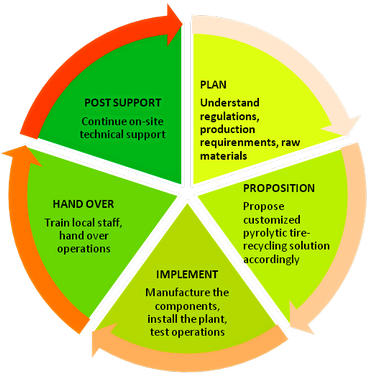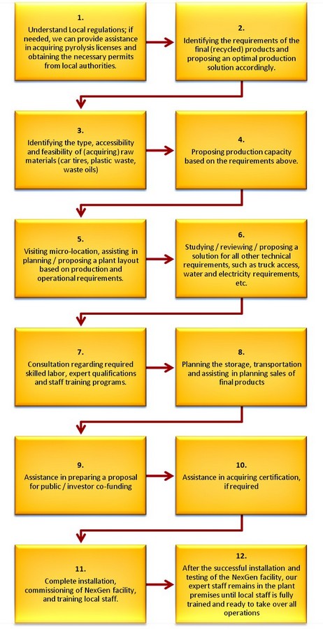 The following outlines the steps and major milestones in building a customized NexGen pyrolytic tire recycling facility by SGI Technology:
